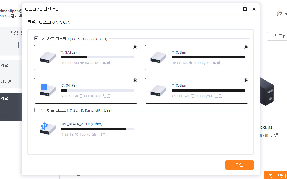 어디에 복구할지 파티션을 확인 합니다.