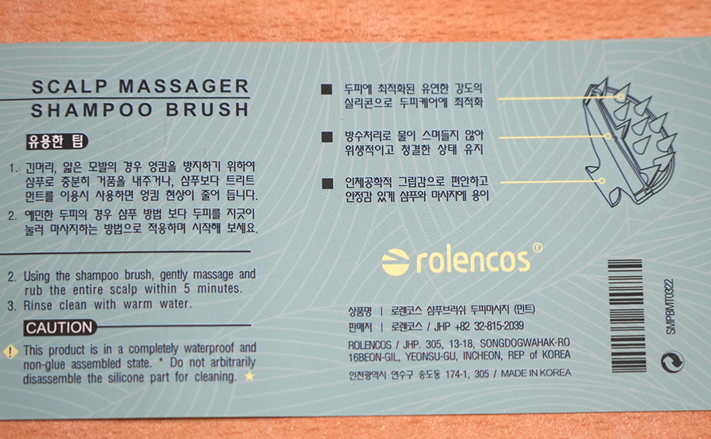 종이 설명서에는 어떻게 사용하면 좋은지 적혀 있습니다. 처음에는 일반 샴푸처럼 충분하게 거품을 내준 뒤, 그 뒤에 로렌코스 샴푸브러쉬를 쓰면 됩니다.
