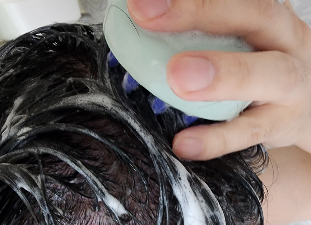 손가락 끝으로 해도 되겠지만, 전용 도구를 이용하면 두피에 자극을 덜 주면서 부드럽게 세척이 가능합니다.