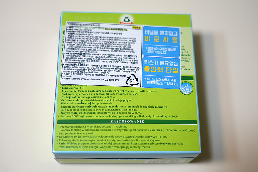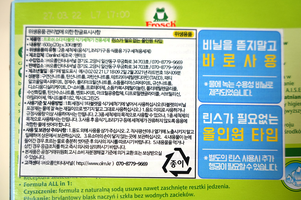 식기세척기를 쓰면 함께 사용할 식기세척기 세제에 대해서 관심이 많아지는데요. 프로쉬 식기세척기 세제를 이번에 써 봤습니다. 독일 국민 세제 실제로 안전하고 좋은 세제로 알려진 제품인데요. 프로쉬라는 뜻이 독일어로 개구리라는 뜻 이니다. 개구리는 1급수와 같은 건강한 생태계에서 살아갈 수 있는데 인간과 자연에 이로운 프로쉬라는 모토로 제품을 만들고 있다고 하는데요. 프로쉬 식기세척기 세제를 그래서 믿고 쓸 수 있겠다고 생각이 들어서 구매를 해 봤는데요. 그리고 이 제품은 무향입니다. 식기세척기 세제에 향이 들어가는 제품들도 있긴 한데요. 개인적으로는 향이 없는 제품을 선호하므로 이 것을 쓰고 있습니다. 세척력은 밀레 정품세제나 케스케이드 같은 제품이 강력하다고 생각하는데요. 세척력만 생각하면 케스케이드가 정말 최고죠. 그런데 향이 좀 나는 이유로 프로쉬 식기세척기 세제를 지금은 쓰고 있습니다.