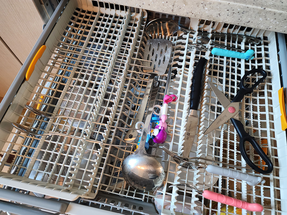 상단 바스켓에 넣어둔 숟가락과 가위도 깨끗 합니다. 특히 세제가 좋으면 스테인레스 재질들이 반짝반짝 빛이 납니다.
