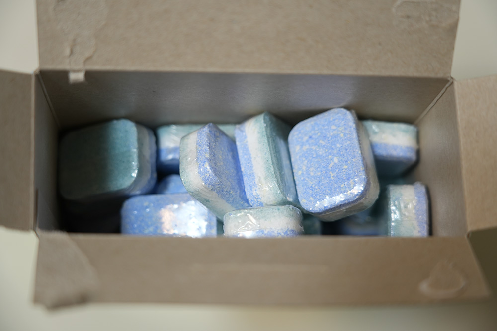 종이 박스를 열어보면 타블렛 형태의 프로쉬 세제가 보입니다. 세제도 비닐체로 그대로 사용하는 형태 입니다. 박스도 종이로만 되어있어서 그대로 종이를 재활용 가능합니다.