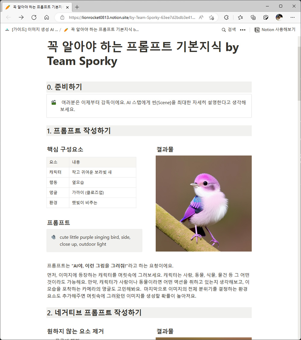 사용하기 전에 간단히 설명서를 읽어보는게 좋은데요. 설명서에서는 프롬프트에서 뭘 할 수 있는지, 세부 옵션들로 어떤 내용을 조정할 수 있는지 자세히 적혀 있습니다.