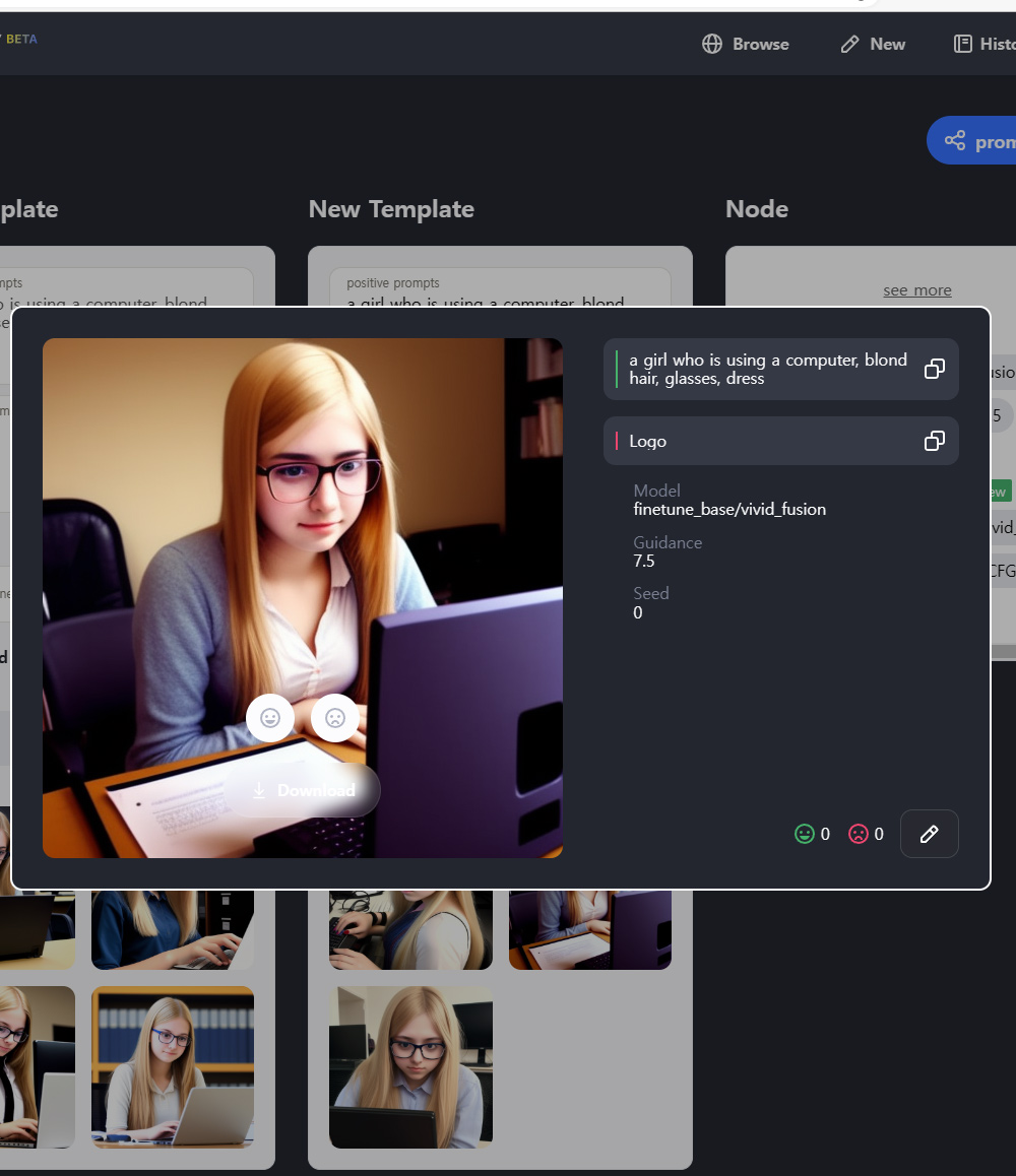 잠깐의 생성 시간이 지난 뒤, 컴퓨터를 하고 있는 여성 사진이 나옵니다. 아직은 베타 서비스라 4개의 이미지까지만 생성이 되고, 이미지 크기도 제한이 있는것으로 보입니다.