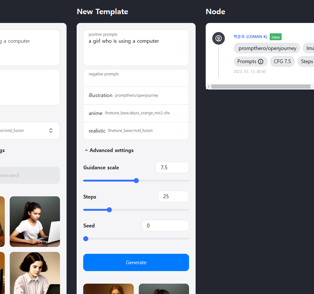 고급 옵션을 통해서 더 다양한 이미지를 만들 수 있스니다. Steps를 조정해서 더 여러단계를 거친 완성도 높은 이미지를 만들 수 있고 좀 더 자유도를 많이 줘서 결과물을 다양화 할 수 도 있습니다. 제가 입력한 내용은 오른쪽에 Note 부분에 명령어로 표현이 되기도 합니다.