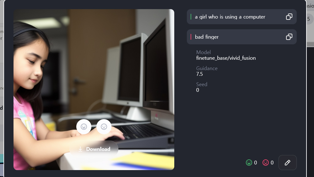 생각보다 결과물은 괜찮았는데요. 컴퓨터를 하고 있는 소녀 모습이 나옵니다. 근데 손가락이 좀 이상하게 나오긴 하죠. 이부분은 빼야하는 부분에 내용을 넣어 보정하는게 가능합니다. 실제로 AI 가 그린 그림 중 손가락이 좀 이상하다는 내용이 많은데 이 부분은 교정을 통해서 뺄 수 있습니다.