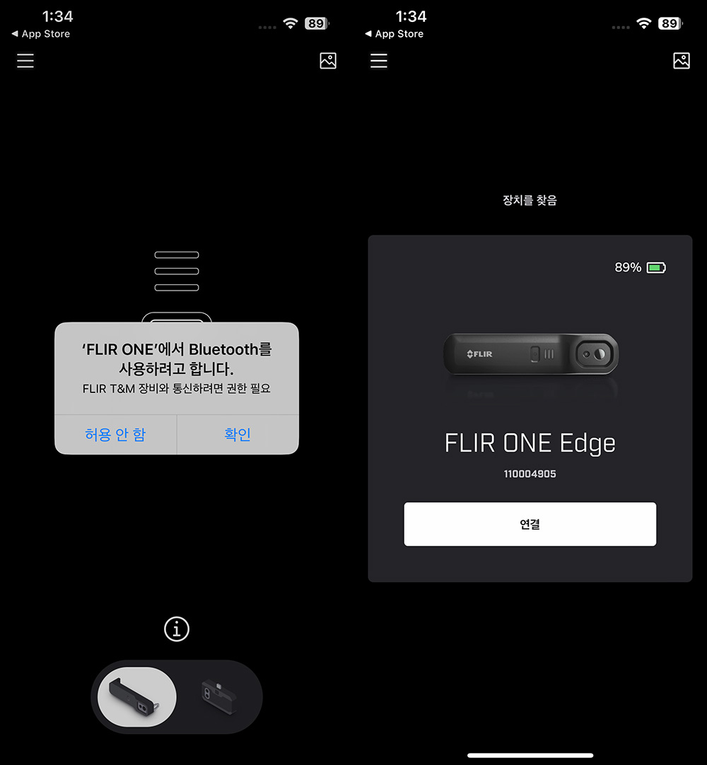 블루투스를 사용하려고 한다고 뜨는데 확인을 누릅니다. FLIR ONE Edge를 찾았다고 나오는데 연결 버튼을 누릅니다.