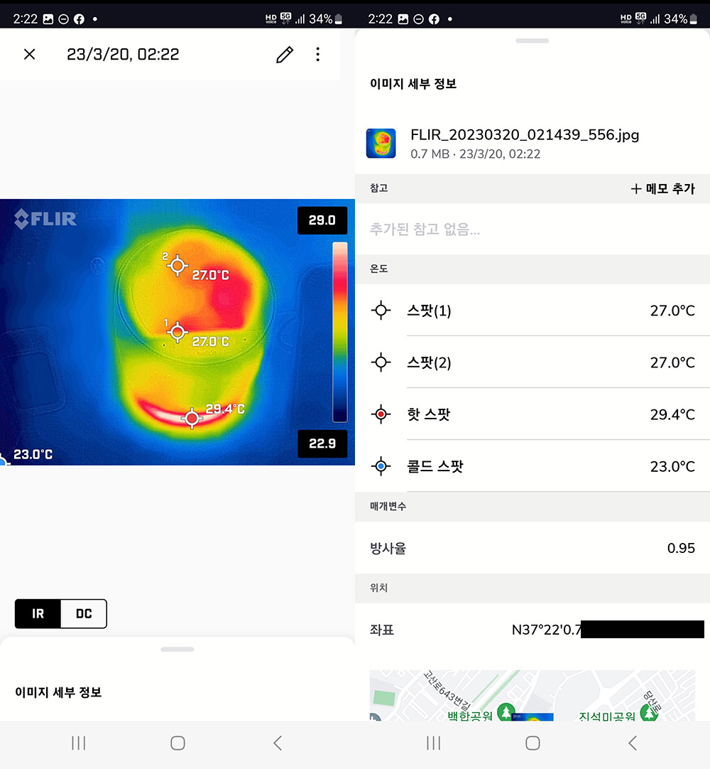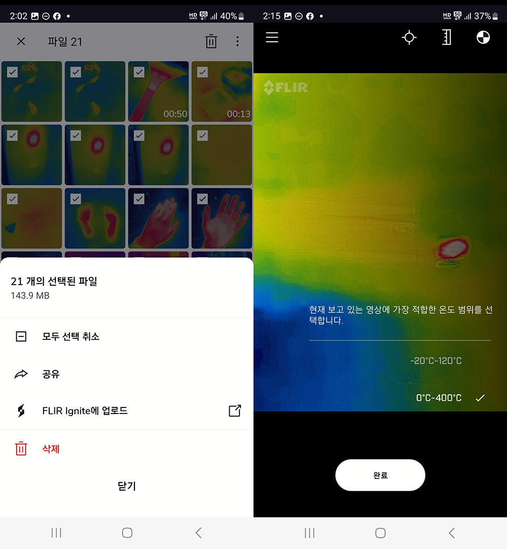 촬영한 이미지는 바로 스마트폰으로 들어오는 형태이고, 사진을 선택해서 공유를 하거나 FLIR 클라우드(FLIR Ignite)에 업로드도 가능합니다.