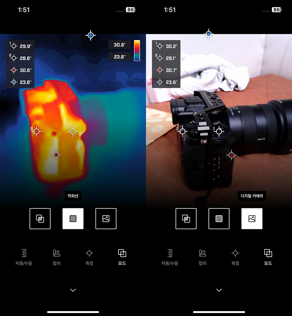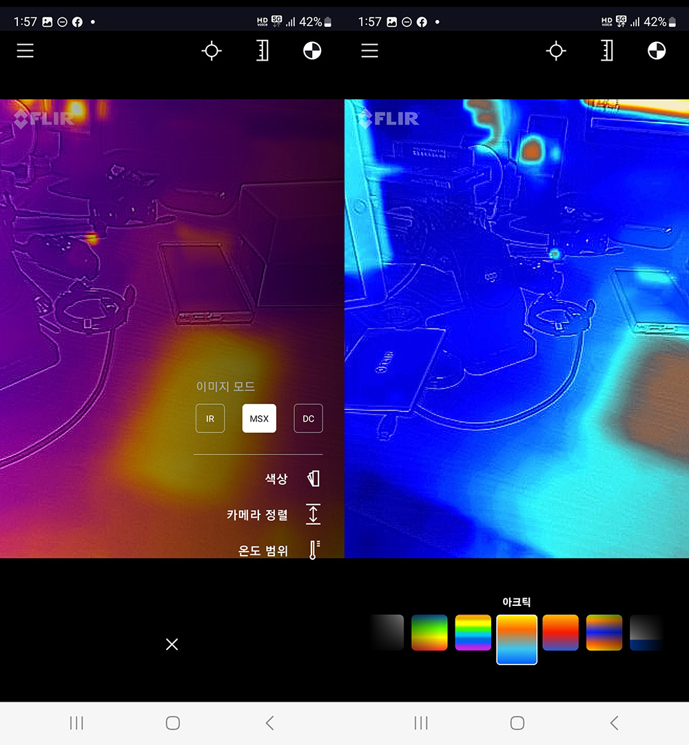 모드에서는 MSX가 기본값이긴 했지만, 적외선과 디지털 카메라를 선택해서 열화상이미지만 또는 카메라 사진만 보는것도 가능 합니다.