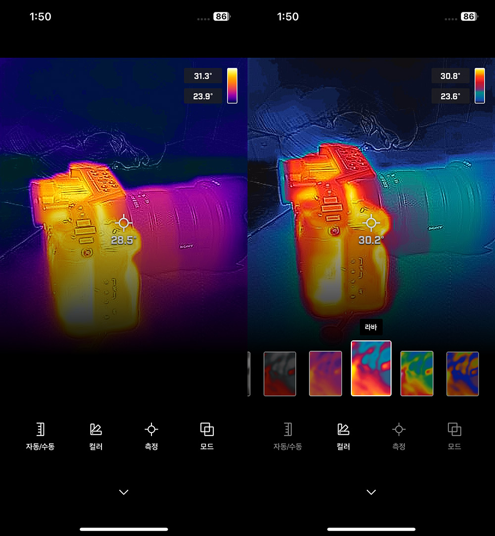 아래 메뉴에서 다양한 설정이 가능합니다. 열측정 범위를 자동 또는 수동으로 변경 할 수 있고, 컬러 팔레트를 조정할 수 있습니다. 컬러팔레트는 이미지로 잘 구분되어있어서 선택하기 편했습니다. 팔레트를 바꾼다고 열을 측정하는 부분이 바뀌거나 하는것은 아니지만, 눈으로 보기에 쉽게 파악할 수 있도록 도움을 줍니다.