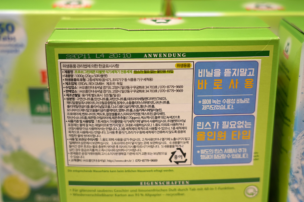 프로쉬 식기세척기는 독일 제품인데요. 이 제품도 제조국은 독일 입니다. 구연산나트륨이 주 원료이고 이외에 여러가지 재료가 들어가 있습니다.