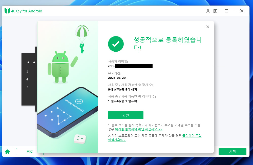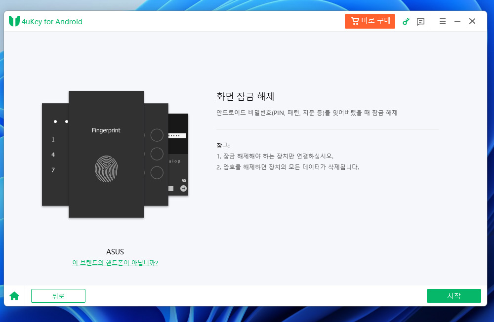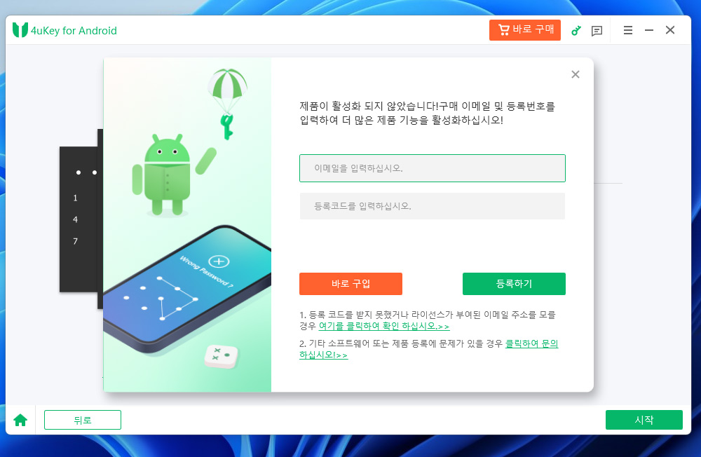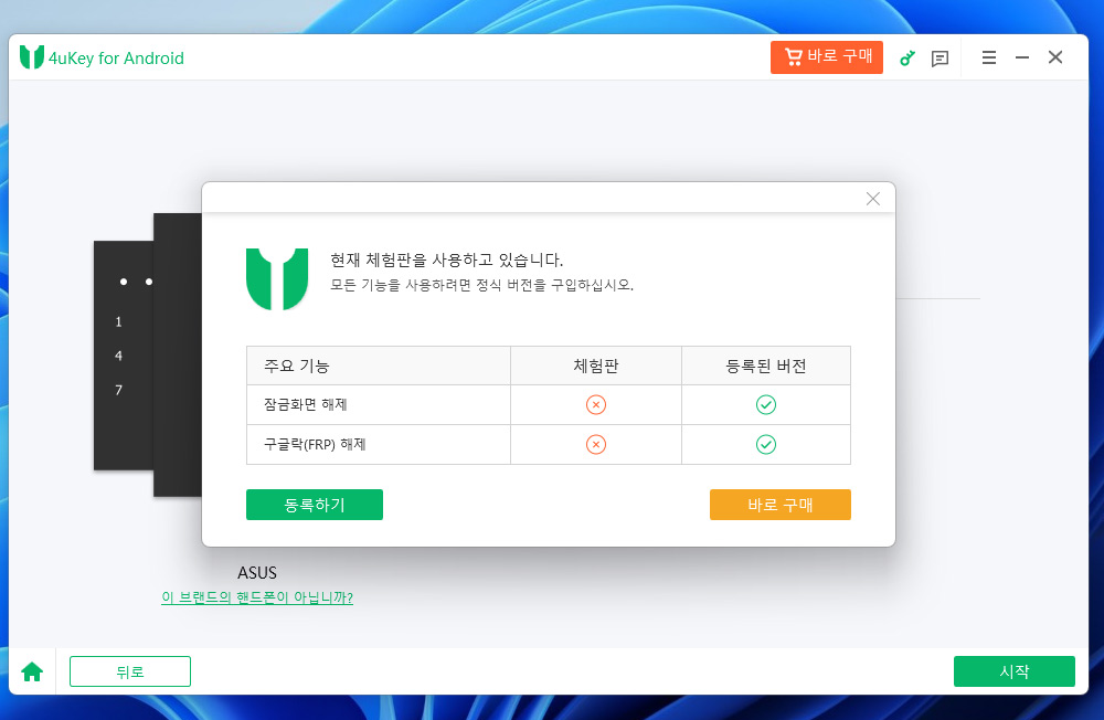 이번에는 데이터 손실이 있는 방법으로 화면 잠금 해제 방법을 선택해 봣습니다. 실제로 시작 버튼을 눌러보면 체험판에서는 안된다고 나옵니다. 결제가 필요하죠.