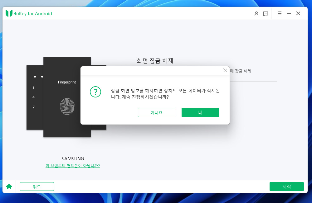 시작 버튼을 눌러보면, 잠금 화면 해제할 때 데이터가 모두 삭제된다고 나옵니다. 네를 누릅니다.