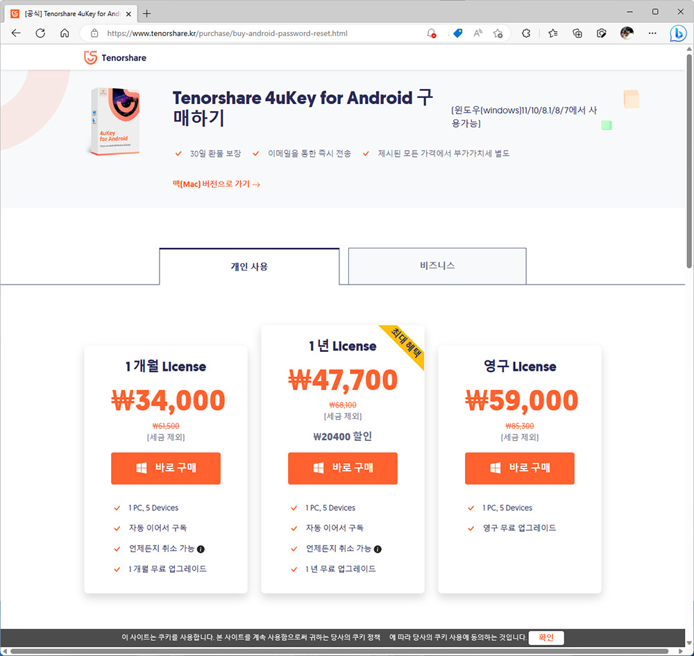 한달 (자동연장) , 1년 , 영구 라이센스를 구매할 수 있습니다.