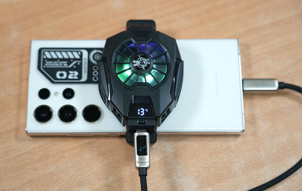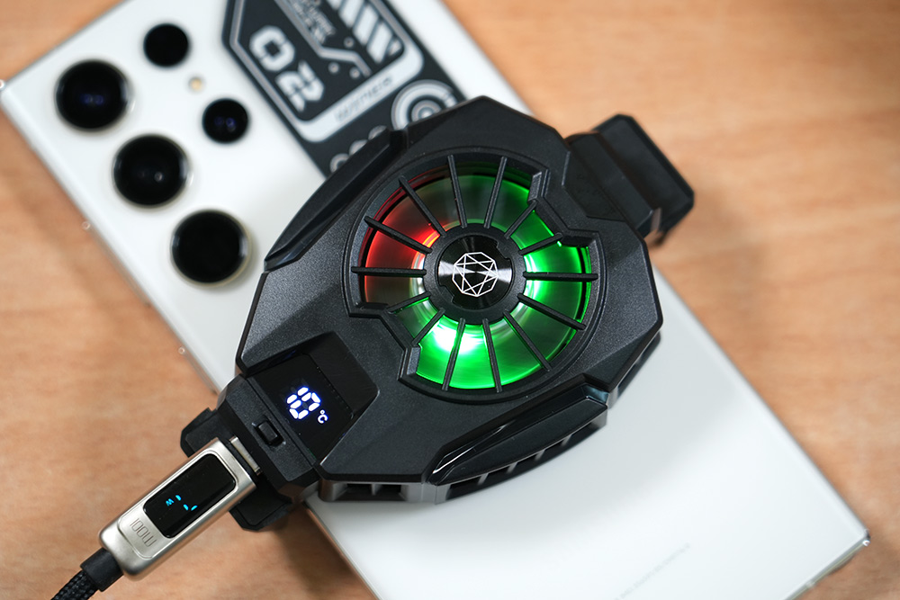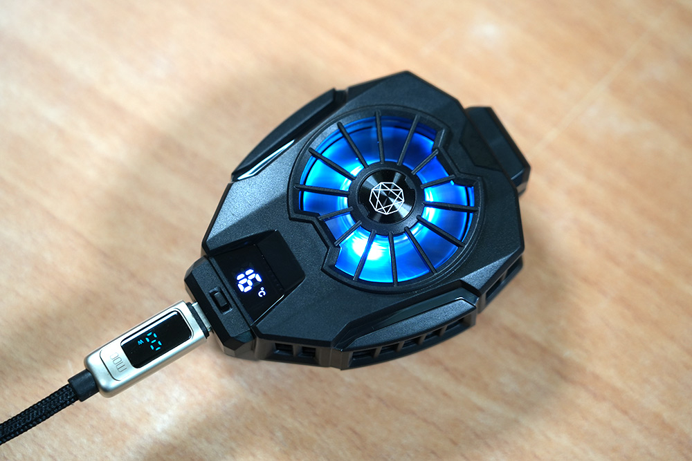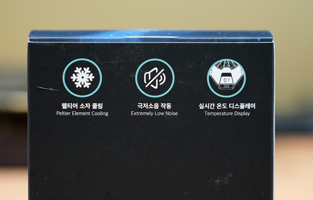 일반적인 팬이 돌아가는 방식이 아니라 펠터어 소자를 이용해서 쿨링을 하는 방식 입니다. 소형 냉장고에도 사용되는 방식인데요. 한쪽은 열을 잃고 반대쪽으로 열이 이동하여 냉각시키는 방식인데요. 스마트폰의 열을 좁고 한정된 공간에서 낮춰야할 때 효율적인 방법 입니다. 열은 발생되므로 냉각팬이 들어가는데 소음이 비교적 낮은 팬이 들어갑니다. 그리고 실시간 온도 모니터를 할 수 있는 디스플레이가 있습니다.