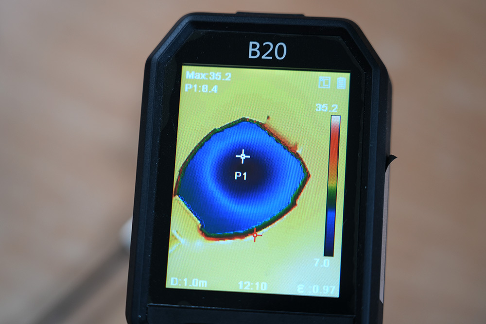 한참 동작시킨 뒤 어썸컨셉 아이언윙 PRO의 안쪽 부분을 열화상카메라로 찍어봤습니다. 8.4도가 나옵니다. 실제로 만져보면 차가운 콜라캔 만지는것처럼 차갑습니다. 너무 차가워서 온도차이 때문에 물기가 생길정도 인데요.