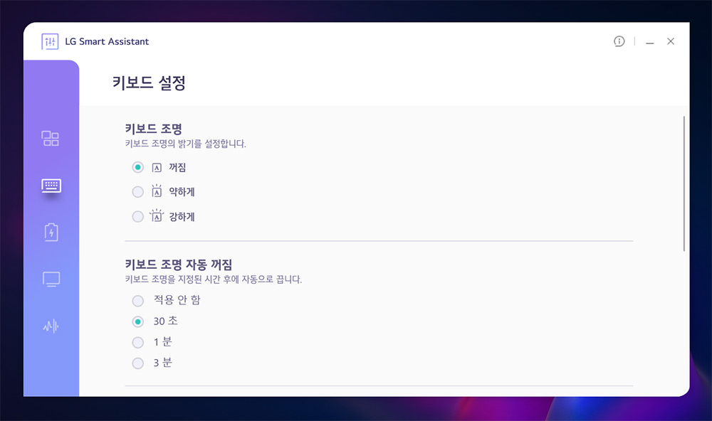 키보드 설정에서는 조명의 밝기, 조명 자동 꺼짐 시간을 설정할 수 있습니다.