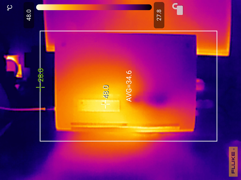 후면 부분에서 보면 한쪽 부분에서 발열이 높게 측정이 됩니다. 이번에 새로 바뀐 쿨러의 위쪽 부분에 발열이 높게 보이는데요. CPU와 GPU를 보다 효율적으로 냉각시키려고 사각형태의 블럭이 사용된 것 같습니다.