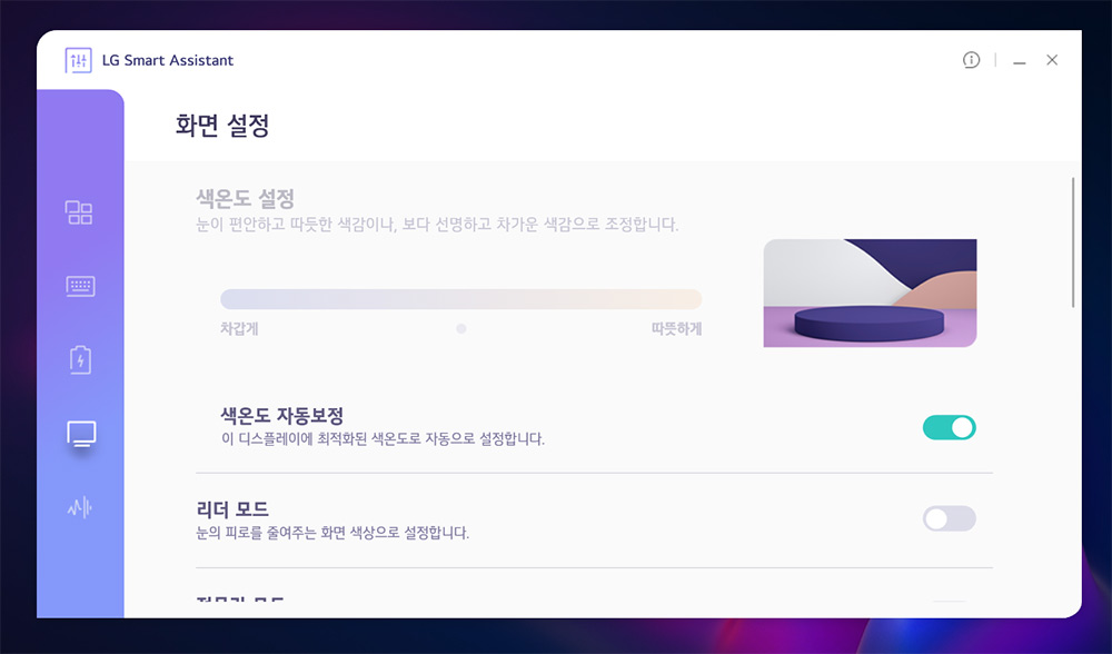 화면 설정을 통해서 색온도와 리더 모드를 사용할 수 있습니다