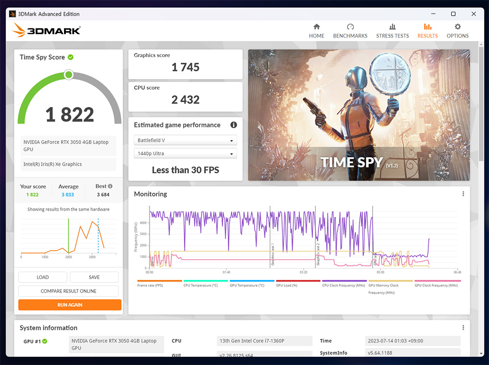 3DMARK Time Spy 그래픽점수는 1745점으로 나오는데요. 물론 고성능의 그래픽카드를 넣은 것은 아니므로 게임을 월등하게 하기 좋다 이렇게 말하기는 좀 애매합니다. 하지만 CUDA 코어를 활용한 작업이나 온라인 게임정도는 할 수 있습니다.