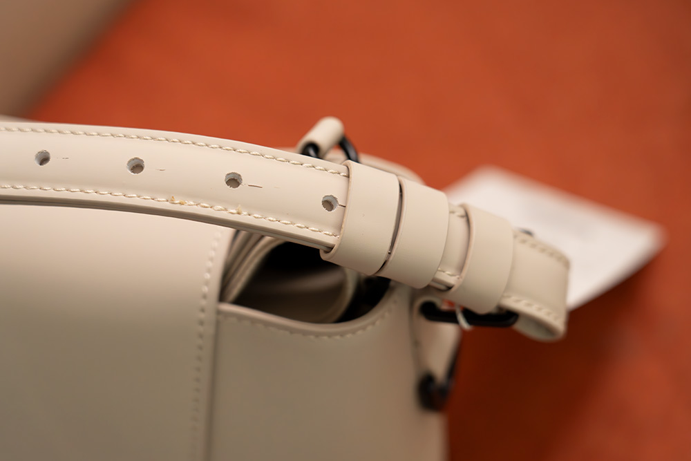 폴리우레탄을 코팅한 폴리에스테르를 사용했는데요. 겉감의 느낌은 만지는 느낌이나 구부리는 느낌은 가죽처럼 나쁘진 않습니다. 안감에 좀 특이한 가죽느낌이나 그런것은 흉내낼 수 는 없겠으나, 실제 사용시에는 그런 부분은 크게 중요하진 않더라구요. 외부 부분을 봤을 때는 박음질은 깔끔하게 잘 되어있었구요. 작은 손잡이 부분에 구멍도 잘 뚫려 있었는데요.