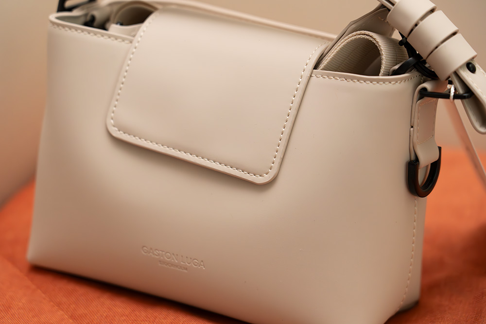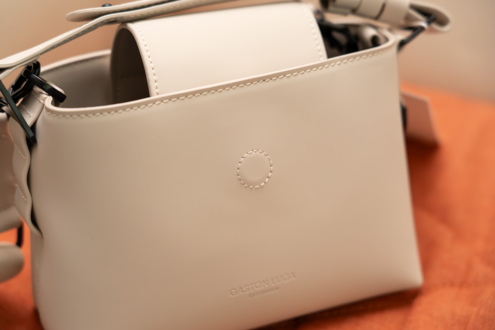가방은 안에 뭔가 넣지 않아도 모양이 어느정도 유지 되는 형태였구요. 상단과 커버 부분에는 박음질이 되어있고, 아래쪽에는 박음질이 안보이는 형태 인데요. 전면 부분에 음각으로 가스톤루가 로고가 있습니다.