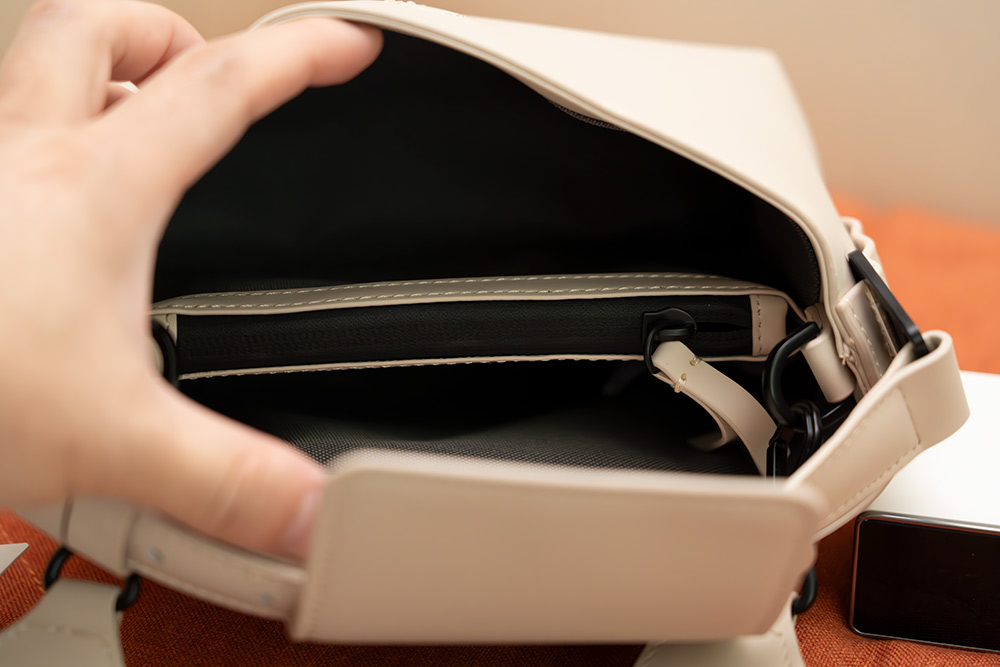 내부에는 2개로 나눠진 공간이 있는데요. 가운데 부분에는 지퍼로 숨겨진 또 다른 공간이 있습니다.