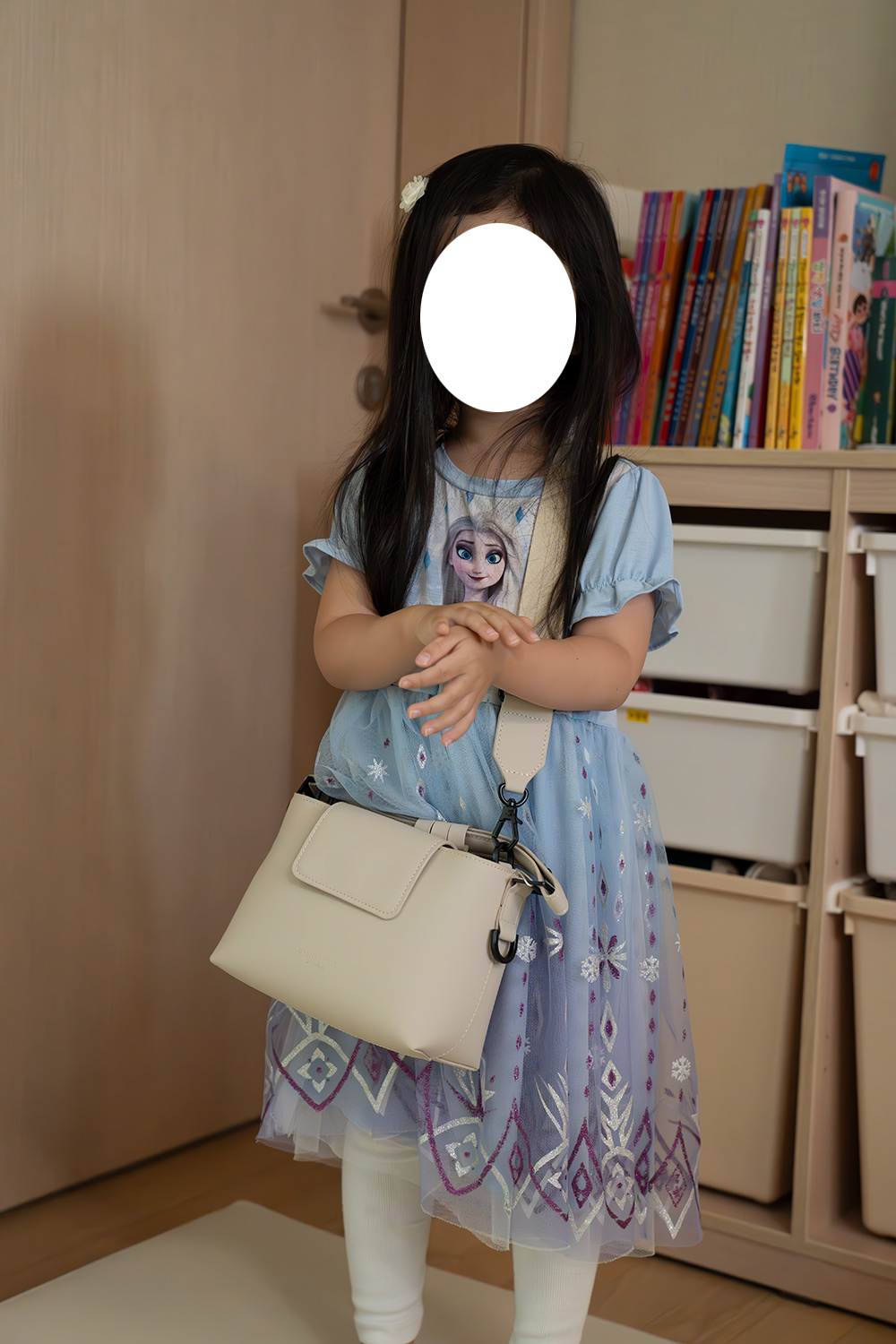 아이가 마음에 들어서 가방을 착용을 해 봤는데요. 잘 어울리더라구요. 아이가 들고 있어서 약간 커보이지만, 실제로는 어른이 사용하면 작은 소형백 정도의 사이즈 입니다.