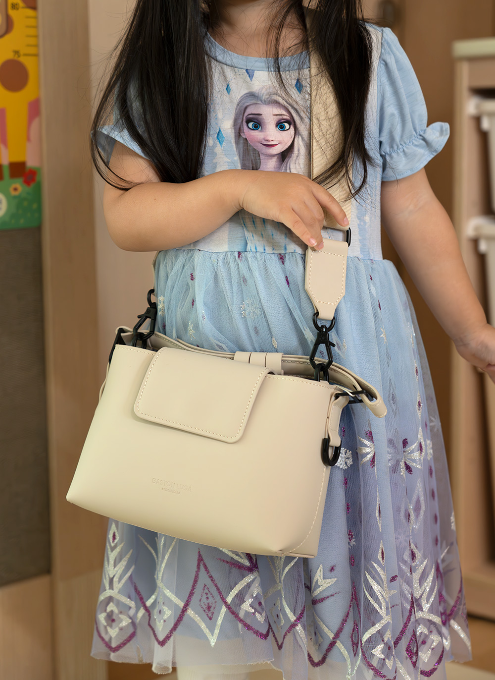 아이가 마음에 들어서 가방을 착용을 해 봤는데요. 잘 어울리더라구요. 아이가 들고 있어서 약간 커보이지만, 실제로는 어른이 사용하면 작은 소형백 정도의 사이즈 입니다.