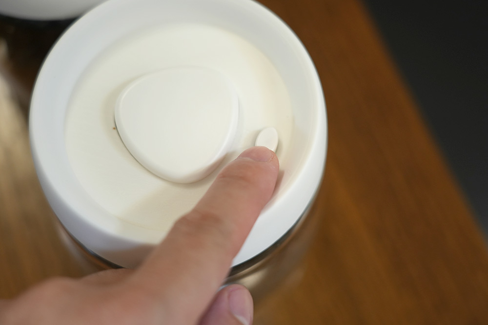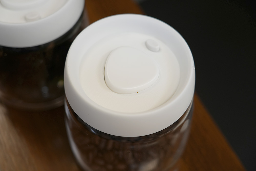 덮개를 닫고 큰 버튼을 여러번 누르면 유리병의 내부 공기가 외부로 빠지게 됩니다. 몇번 누르다 보면 버튼이 좀 들어간 상태가 되는데 그 상태가 진공상태가 되는 것 입니다.