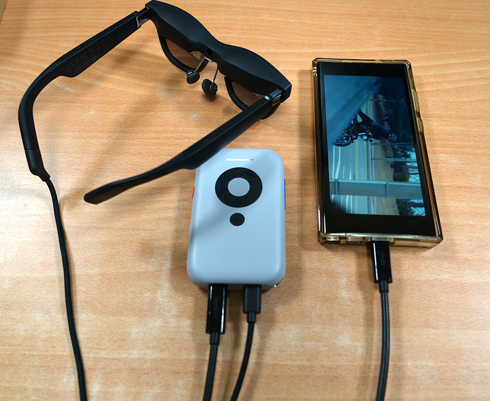 XREAL Beam은 배터리가 들어가 있어서 XREAL Air2를 구동할 수 있도록 해주고, 흔들림 방지 기능 그리고 무선으로 장치들을 연결할 수 있도록 해줍니다.