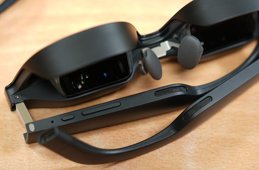 제품을 보면 상단에 마이크로 OLED 화면이 있고 이것을 반사경을 통해서 눈으로 보내주는 형태 입니다. 화면주사율은 120Hz이고, 화면이 500nit 밝기를 자랑하는데요. 엄청 밝고 선명해서 야외에서 봐도 주변도 보면서 화면도 선명하게 볼 수 있습니다.