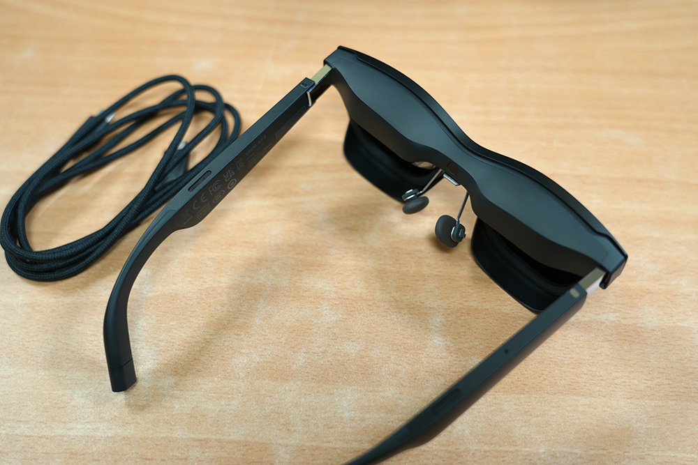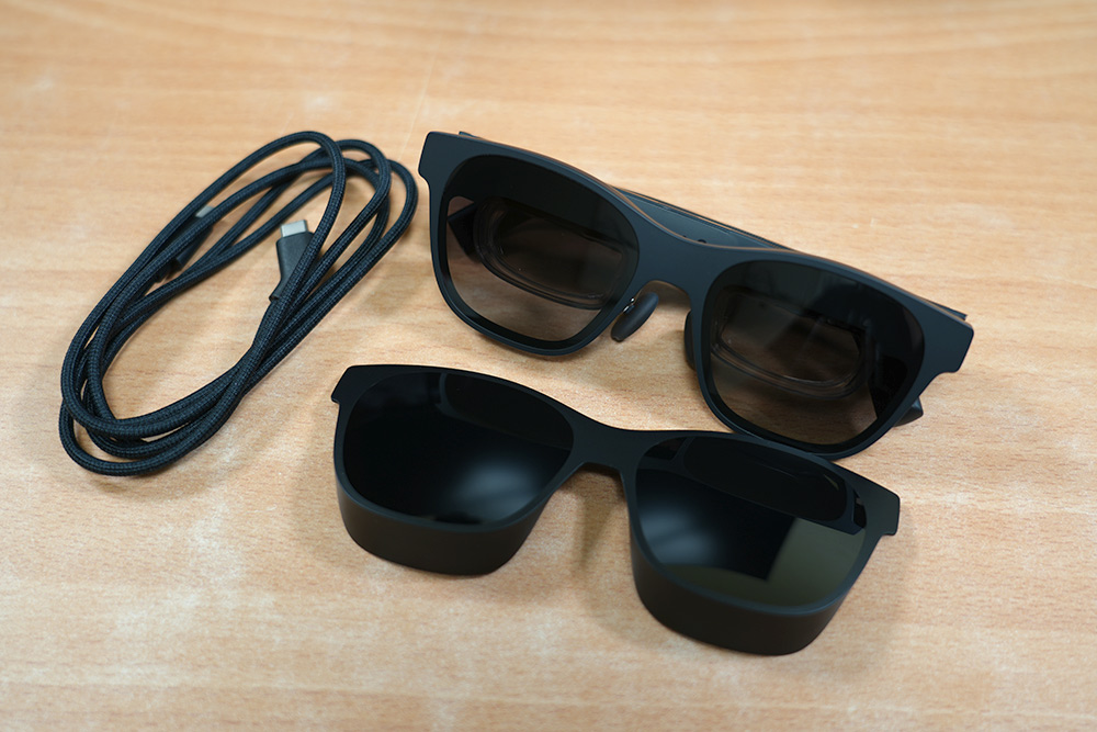 XREAL Air2 본체와 라이트 실드, 케이블이 보입니다. 라이트 실드는 앞부분을 완전히 막아 화면만 보이도록 해서 몰입감을 높여줍니다. 대신 본인도 화면 외에는 다른 부분은 보이진 않습니다. 개인적으로는 라이트 실드를 쓰지 않고 써도 화면이 충분히 밝아서 그냥 써도 괜찮더라구요.