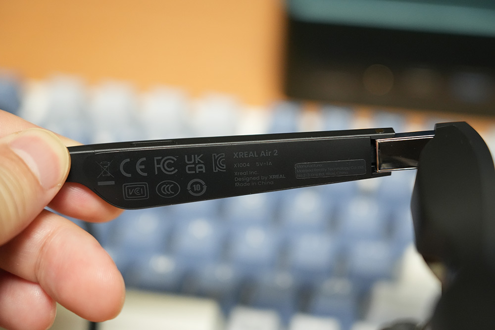 소스를 입력해주는 기기를 연결하는 단자와 충전을 위한 단자가 왼쪽에 있고, XREAL Air2를 연결하는 단자가 오른쪽에 있습니다.