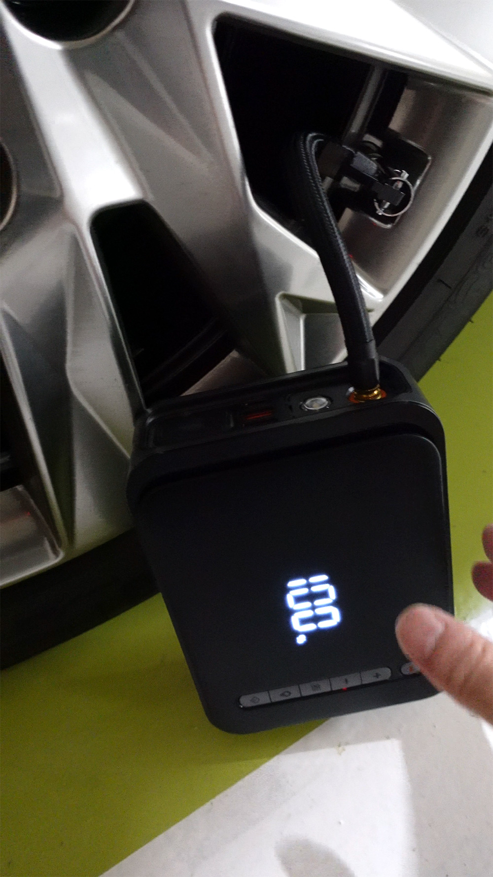 그런데 지금 소개하는 베이스어스 점프스타터 에어펌프는 평상시 에어펌프 역할로 사용이 가능합니다. 배터리 잔량도 백분율로 나와서 확인하기 편합니다. 타이어 공기압은 냉간시 기준으로 맞추는게 좋은데요. 바람을 무료로 넣겠다고 세차장이나 타이어 가게 등으로 이동을 하면 그 때 타이어가 열을 받아서 적절한 공기압을 맞추는게 어렵습니다.