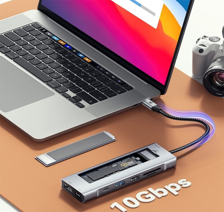 10Gbps까지 속도를 지원하는데요. PD 100W 충전까지 할 수 있습니다. 노트북을 충전하려면 충전 케이블을 어차피 연결 해야하는데요. 이 연결을 할 때 모든 장치들이 같이 연결되도록 할 수 있습니다.