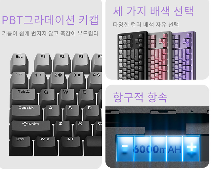 키보드는 PBT 그라데이션 키캡 입니다. 아래쪽은 짙고 위로는 연한 키캡으로 되어있어서 단조로움이 없고 깔금한데요. 배터리는 6000mAh 대용량 배터리가 들어가 있습니다. 대기시간이 길고 무선으로 길게 사용이 가능합니다.