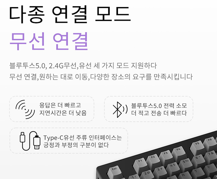 USB-C 유선 연결은 물론 블루투스 5.0 연결, 2.4G 무선까지 가능해서 어떤 컴퓨터, 노트북, 태블릿, 스마트폰과도 연결이 가능합니다.