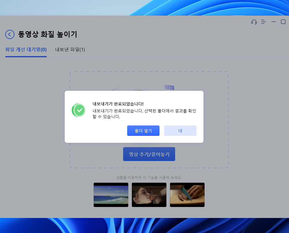 영상 화질 개선은 시간이 꽤 많이 걸립니다. 영상 시간이 길다면 컴퓨터 사양이 좀 좋은 편이라고 해도 시간이 좀 많이 걸릴 수 있습니다.