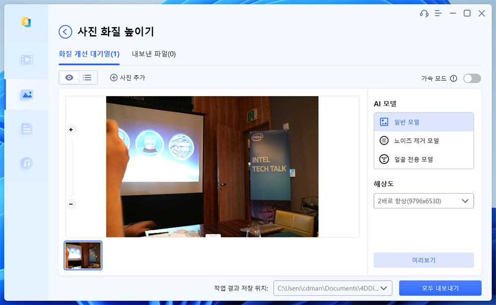 사진 화질을 높이는 것도 가능한데요. 좀 흐린 사진을 선택을 해 봤습니다. AI 모델은 일반모델, 노이즈 제거, 얼굴 전용이 있는데요. 원하는것을 선택하면 됩니다.