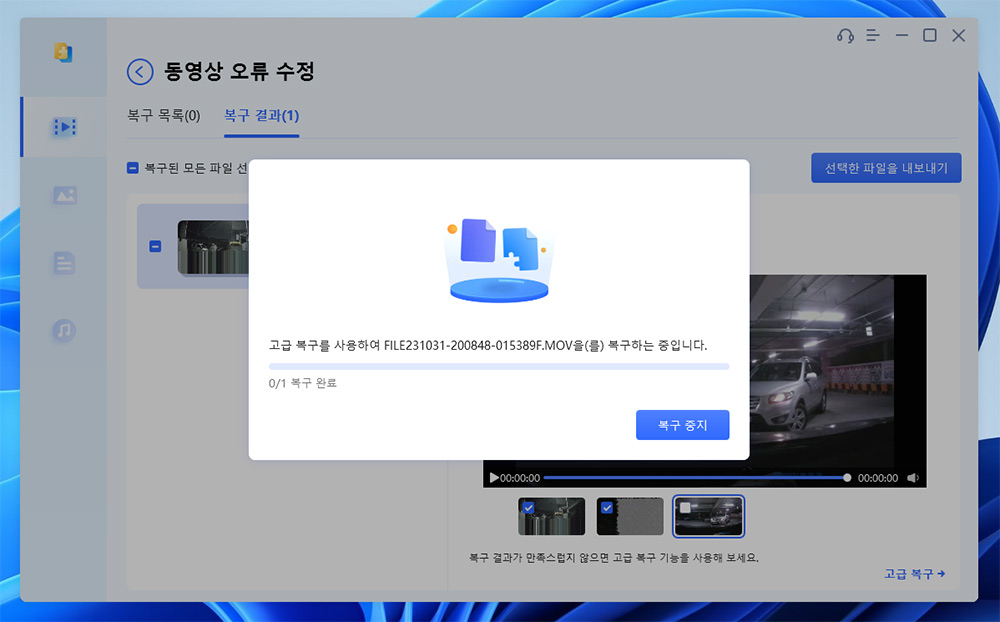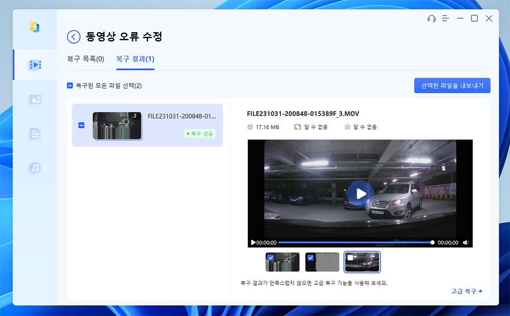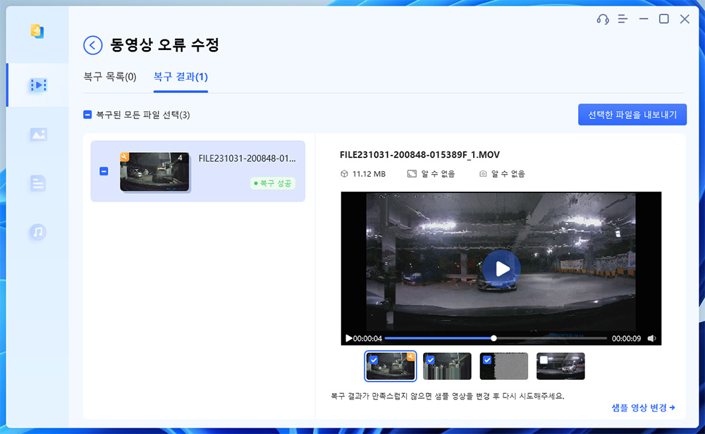 파일을 선택해보니 정말 복구가 되긴 하네요. 파일이 손상이 심해서 완전하게 재생이 되진 않았으나, 일부 내용들이 살아있어서 영상을 확인할 수 있었습니다. 원래는 전문 업체에 맡겨야하는 작업인데 이렇게 간단하게 복구가 되네요.