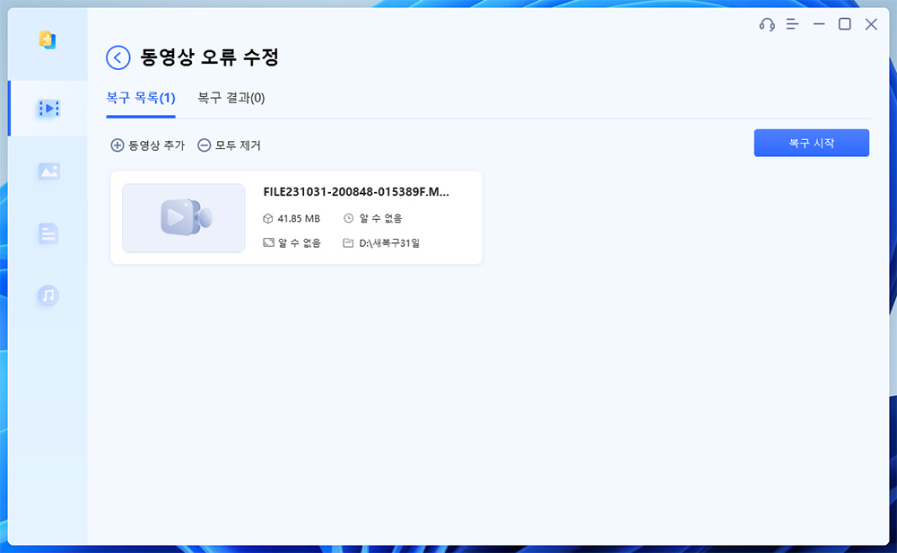 재생이 안되는 파일을 추가를 해 봤습니다. 파일의 정보가 정상적으로 나와야하는데 파일이 손상이 되어서 시간이나, 파일 종류 등이 알수없음으로 나옵니다. 복구 시작을 해 봅니다.