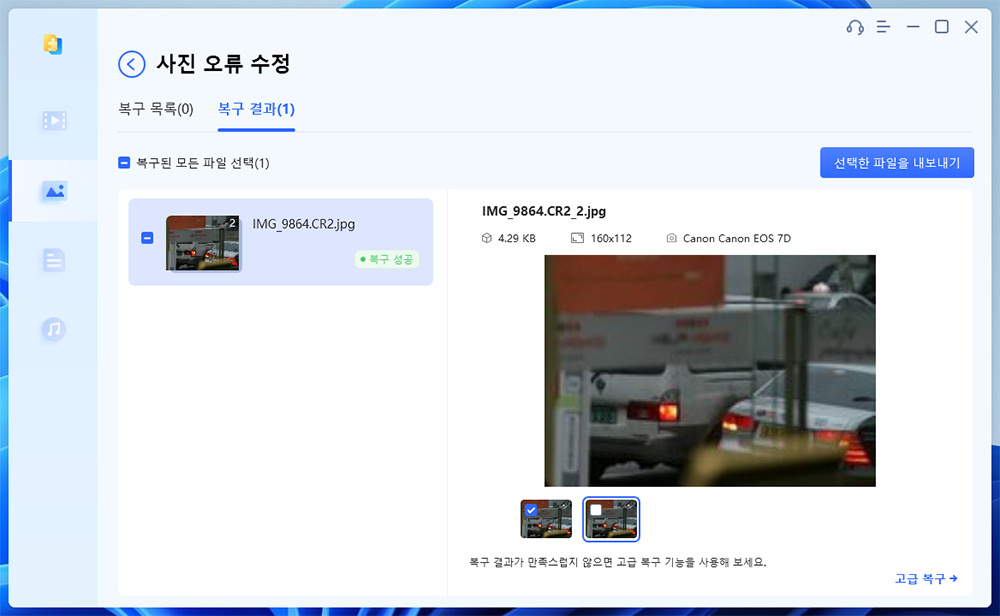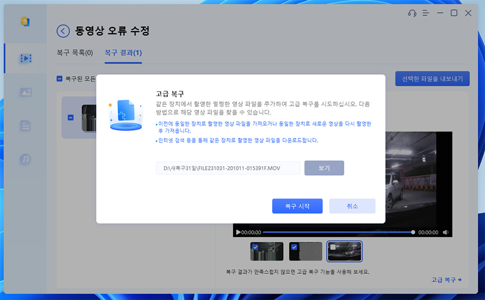 만약 복구가 안될 경우에는 고급복구를 이용할 수 있습니다. 이 경우 같은 기기로 촬영된 정상적인 파일을 샘플로 제공하면 손상된 파일의 복구율을 높일 수 있습니다.