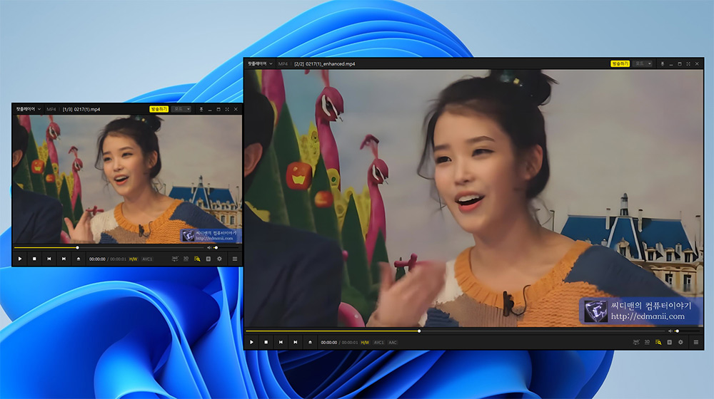 왼쪽이 원본이고, 오른쪽이 개선된 영상인데요. 영상 크기를 최대 4배까지 크게 만들 수 있는데 그에 비해서 영상이 깨끗해졌습니다. 영상이 화질이 떨어질 수록 개선효과는 더 좋습니다.