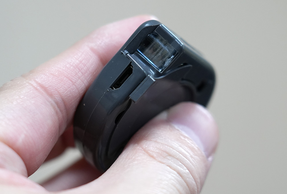 앞 부분에는 Micro USB 충전단자가 있고, 녹색레이저가 나오는 부분이 있습니다. USB 로 충전하면서 재사용이 가능한 타입 입니다.