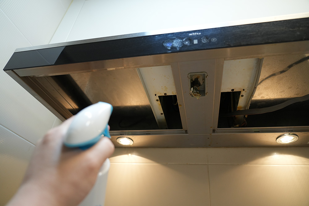 주방 후드도 청소를 해 봤습니다. 안에 뭔가 오염이 많이 되어있네요. 누런 것들이 많이 보입니다.