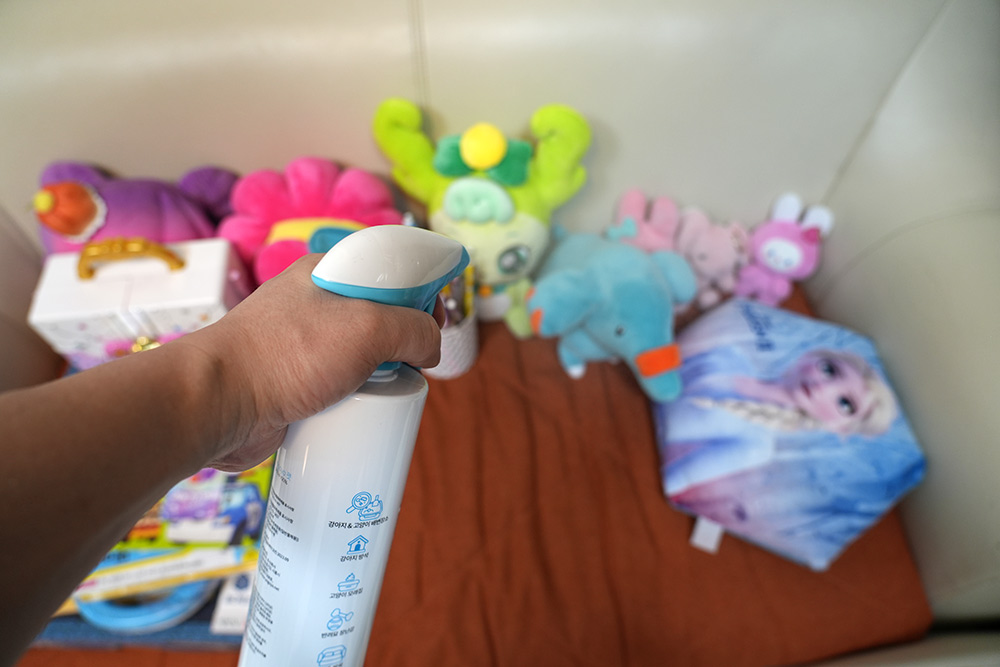 아이가 자주 만지는 물건에도 뿌려두면 좋습니다. 뿌리고 자연 건조하면 됩니다. 표면을 닦아낼 수 있는 것은 닦고 인형이나 페브릭 재질은 그냥 뿌리고 말리면 되니까 편하네요.