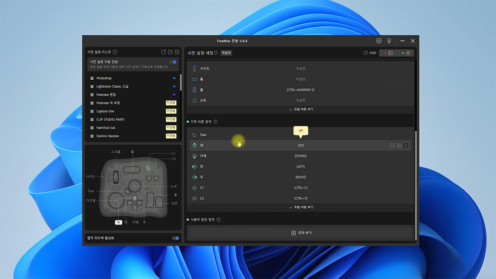 투어박스 엘리트의 핵심 기능은 총 14개의 버튼과 3개의 다이얼에 있습니다. 각 버튼과 다이얼은 원하는 기능으로 자유롭게 설정할 수 있어 사용자의 편집 스타일에 맞춰 최적화된 작업 환경을 구축할 수 있습니다. 버튼에는 클릭감과 진동 피드백 강도를 조절하는 기능까지 제공되어 사용자의 취향에 맞게 미세 조정이 가능합니다.