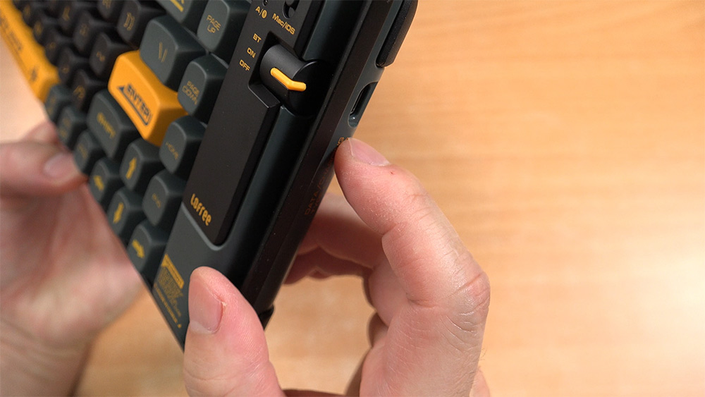 오른쪽에는 충전을 위한 USB-C 포트가 있구요. 오른쪽에는 블루투스와 키보드 켜는 스위치 , OFF 하는 스위치가 있습니다.