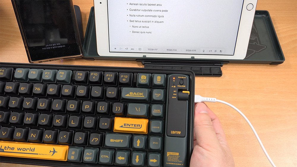 멀티페어링을 하면서 안드로이드 스마트폰과 아이패드를 번갈아가며 사용할 수 있었는데요. 근데 굳이 iOS/Android 모드를 변경해가면서 쓰지 않아도 사용하는데에는 문제가 없었는데요. 다만, 한영키에 해당하는 오른쪽 Alt 키를 입력 시 생각보다 오른쪽에 위치해서 실제 사용시에는 Ctrl + 스페이스바를 입력하는게 좀 더 편했습니다.